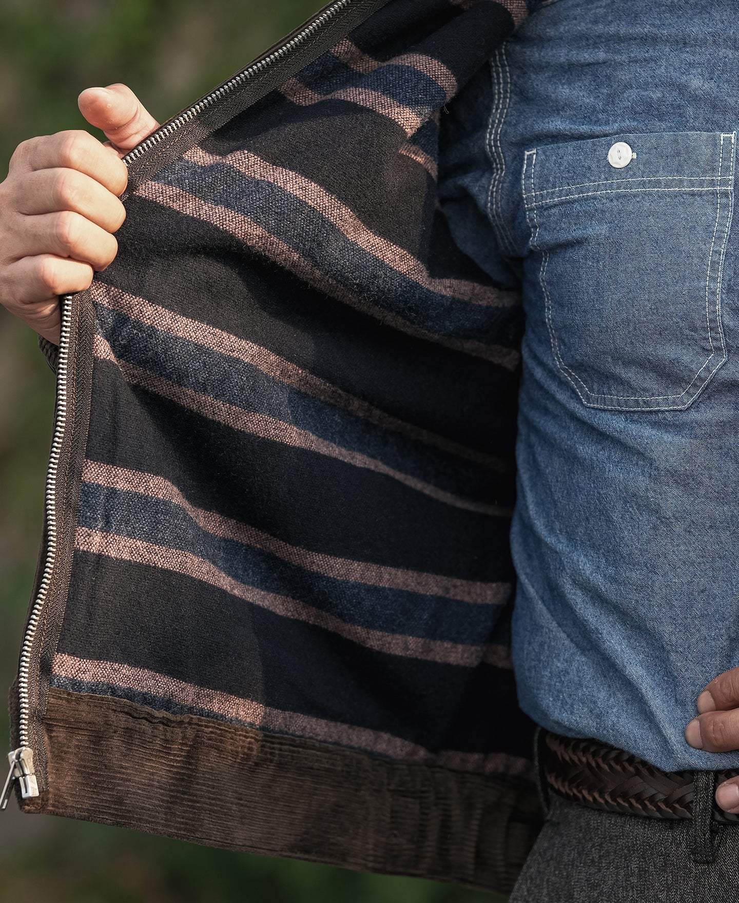 Crafted from heavyweight 500g 9-wale corduroy, it’s finished with a zip-front closure and adjustable side tabs at the hem for a customizable fit. The interior is lined with a warm wool-blend blanket for added insulation, while the entire construction is reinforced with double-needle felled seams for strength and a clean finish. Garment-washed for a soft hand feel and easy care—no dry cleaning required.